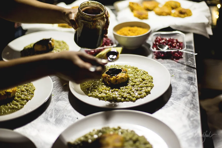 Not only was Karthik the creative officer for the evening, lending us his illustrations and setting up the space, he broke out his Pani Puri hawking avatar again. We started the dinner with Karthik serving our Apple Celery pani puri at the counter- and as guests gathered to get a share of their mouthfuls, we were delighted to see how many came back for seconds. I mean, there's nothing more exciting to watch at dinner than realising you see eye-to-eye on such matters!