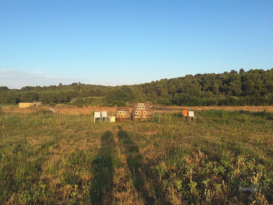 The next day, after a very full day of boating around the island, we got ready for our pick-up by Roki’s. A special van arrived to pick us up along with a couple of other guests. Zipping uphill while continuing to keep an eye on the grand view of the port from atop, we arrived at Roki’s. I wanted to see the cricket field. I jumped off the car and literally ran into the much to the vehement disapproval of the restaurant's sheepdog Sarah. The barrel painted with the score blew my mind!