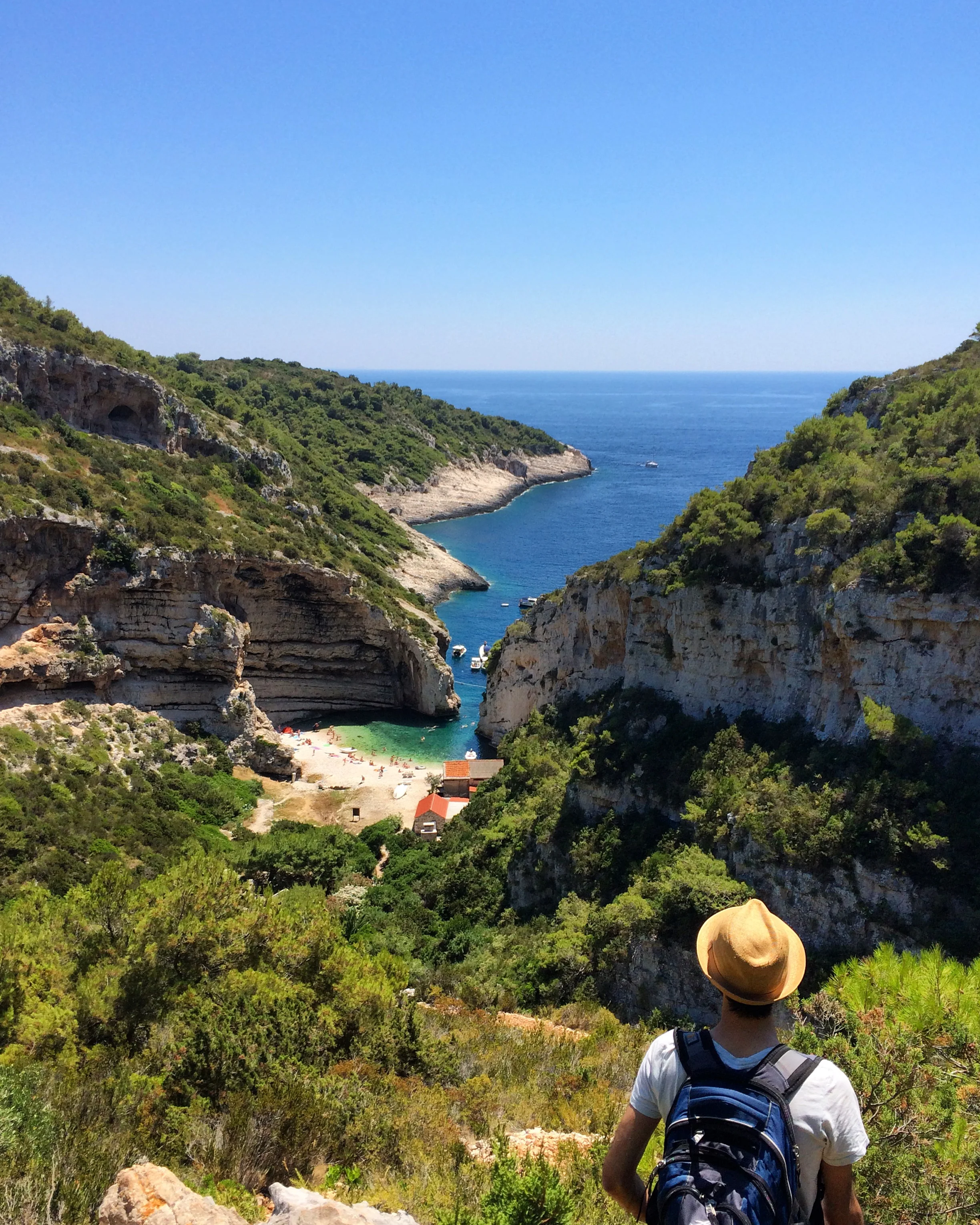 Scooting atop a hill one hot morning, we walked past a sign, off into the bushes trying to find a path down into the secret beach we were promised. The sign said “Stiniva Beach. Descend at your own risk”.